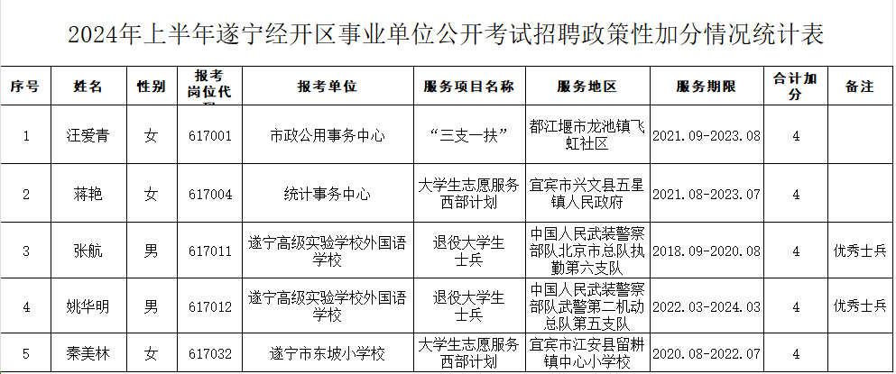 遂宁经济技术开发区党群工作部关于2024年上半年遂宁经开区事业单位公开考试招聘工作人员政策性加分情况的公示