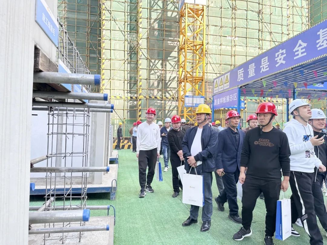 会议结束后,参会的建筑施工单位人员佩戴安全帽在正黄·翡翠天骄标准化施工现场进行观摩,实地学习该项目的文明施工流程。