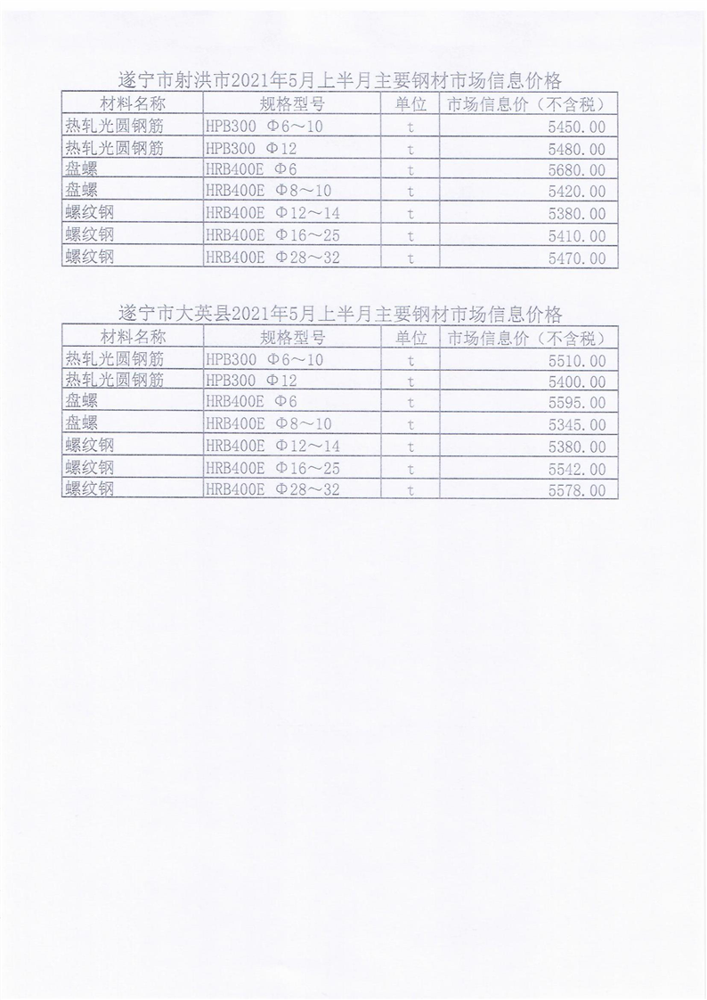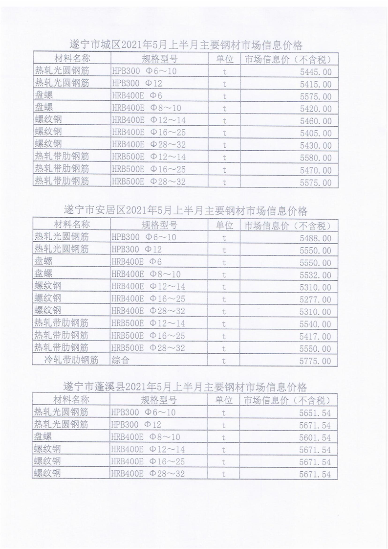 遂宁市2021年5月上半月主要钢材市场信息价