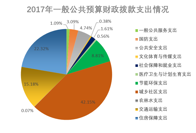 2017年一般公共预算财政拨款支出22,455.45万元,主要用于以下方面:一般公共服务支出245.68万元,占1.09%;国防支出693.32万元,占3.09%;公共安全支出1,064.59万元,占4.74%;文化体育与传媒支出86.08万元,占0.38%;社会保障和就业支出360.52万元,占1.61%;医疗卫生与计划生育支出126.15万元,