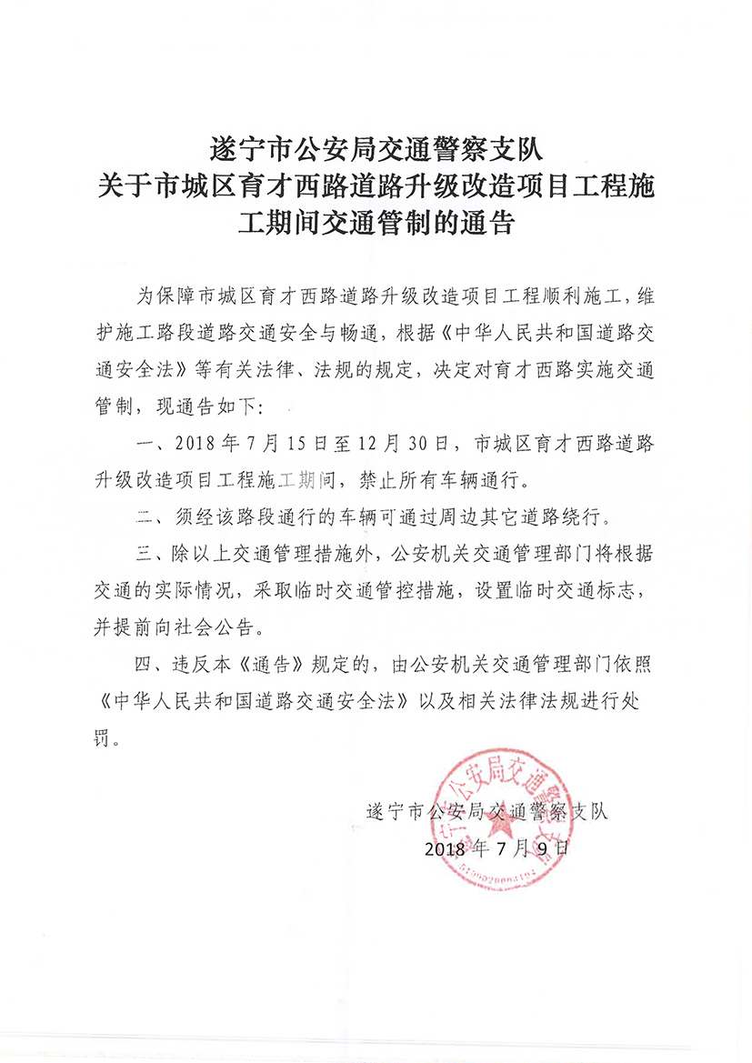 关于市城区育才西路道路升级改造项目工程施工期间交通管制的通告