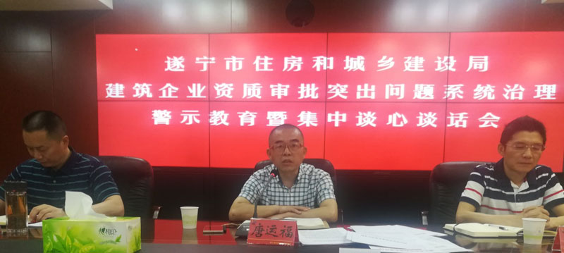 5月20日上午,市住房城乡建设局组织召开建筑企业资质审批突出问题系统治理警示教育暨集中谈心谈话会。市纪委监委驻市住建局纪检监察组副组长唐运福出席会议并讲话,通报学习了建筑企业资质审批违纪违法案例,射洪市、蓬溪县、大英县、市住房城乡建设局相关科室作了表态发言。市住房城乡建设局副局长唐静,机关党委书记张庆,机关相关科室从事资质审批人员,射洪市、蓬溪县、大英县资质审批部门负责人参加会议。