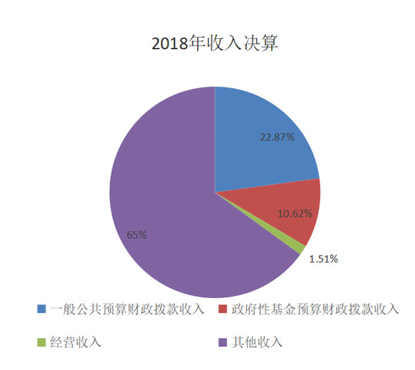 2018年本年收入合计74,868.86万元,其中:一般公共预算财政拨款收入17,118.83万元,占22.87%;政府性基金预算财政拨款收入7,950.06万元,占10.62%;国有资本经营预算财政拨款收入0万元,占0%;事业收入0万元,占0%;经营收入1,133.05万元,占1.51%;附属单位上缴收入0万元,占0%;其他收入48,666.92万元,占65%。