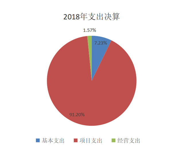 2018年本年支出合计72,185.32万元,其中:基本支出5,219.68万元,占7.23%;项目支出65,832.59万元,占91.20%;上缴上级支出0万元,占0%;经营支出1,133.05万元,占1.57%;对附属单位补助支出0万元,占0%。