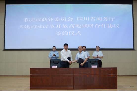 会上,四川省商务厅与重庆市商务委签署了《共建内陆改革开放高地战略合作协议》《推动成渝地区双城经济圈建设商务工作机制》《共建川渝自贸试验区协同开放示范区工作方案》三个文件。根据协议,川渝两地商务部门,将加强统一谋划、一体部署、相互协作、共同实施,着力推动商务领域改革协同、开放协同、产业协同、市场协同、民生协同,全面提升要素和市场活力,共同创建具有时代特征、区域特色的内陆改革开放高地,共同把川渝自贸试验区打造成为具有国际水准、中国特色、巴蜀底蕴的内陆开放示范窗口,为成渝地区双城经济圈建设作出积极贡献。