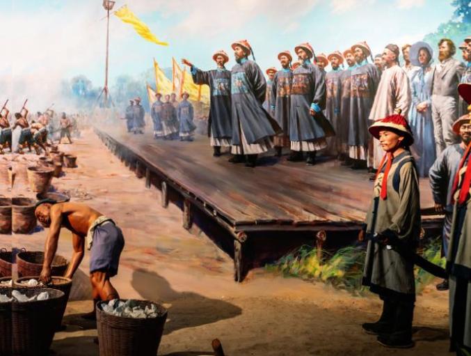 1839年6月3日,林则徐下令在虎门海滩当众销毁鸦片。他采用了传统的“烟土拌桐油焚毁法”,但火烧鸦片时,烟膏油常常渗入泥土中,吸毒者掘地取土,仍得烟膏十之二三,因此就出现了“官府白天烧烟,百姓夜间挖土”的千古奇事。为了彻底销毁鸦片,林则徐经过多次试验,找到了一种新的方法——“海水浸化法”。