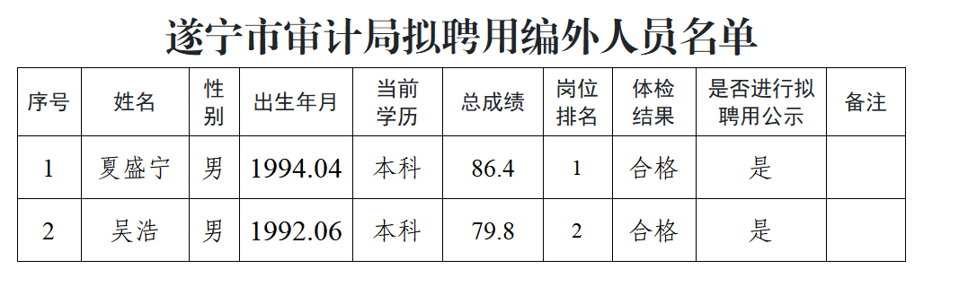 按照“公开、公正、竞争、择优”的原则,经公开招聘、报名、资格审查、面试、体检,拟聘用以下人员为遂宁市审计局编