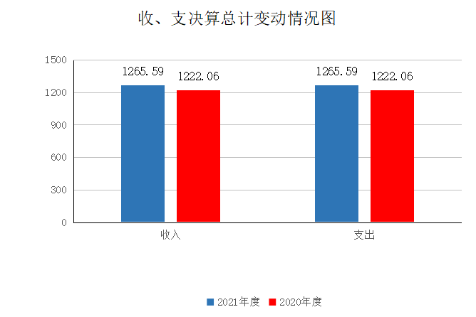 2021年度收、支总计1265.59万元。与2020年相比,收、支总计各增加43.53万元,增长3.56%。主要变动原因是基本支出增加107.03万元,其中人员经费增加99.78万元,增长12.99%,公用经费增加7.25万元,增长3.38%;项目支出增加48.44万元,增长38.08%。年末结转和结余为0万元,减少111.93万元。