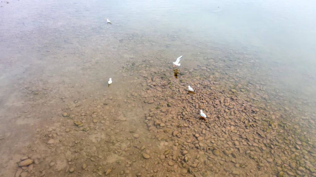 一群红嘴鸥栖息在观音湖中的浅滩上