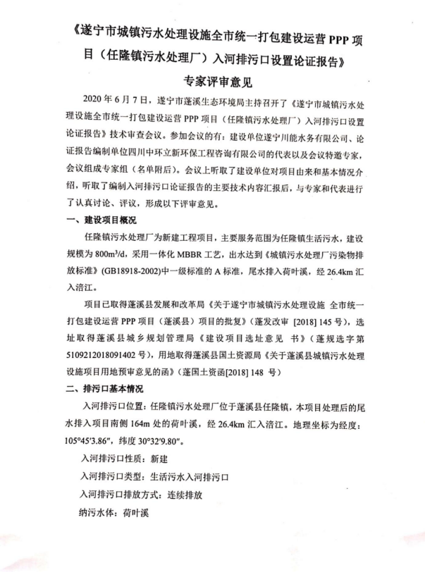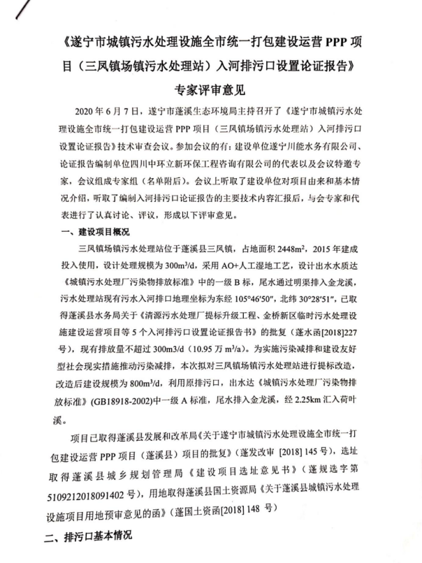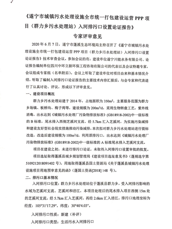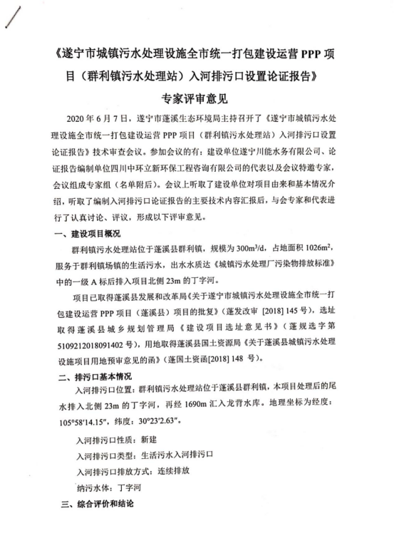 2.《遂宁市城镇污水处理设施全市统一打包建设运营PPP项目(群利镇中和社区污水处理站)入河排污口设置论证报告》专家评审意见
