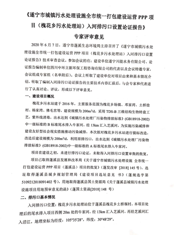 6.《遂宁市城镇污水处理设施全市统一打包建设运营PPP项目(槐花乡污水处理站)入河排污口设置论证报告》专家评审意见