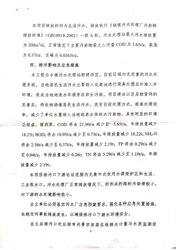 根据你单位提供的资料及入河排污口设置管理规定,同意你单位将处理达标的污水,排入项目西南侧0.2km处的荷叶溪,但必须预留观察取样窗口。排污口地理坐标为经度:东经:105°44′25.00″,纬度:30°25′30.74″;废污水浓度及总量控制要求:最大污水排放量不超过200t/d,尾水排放执行《城镇污水处理厂污染物排放标准》(GB18918—2002)一级A排放标准,主要污染物排放浓度:化学需氧量≤50mg/l、氨氮≤5mg/l、总磷≤0.5mg/l,主要污染物排放总量:化学需氧量≤3.65t/a、氨氮≤0.37t/a、总磷≤0.0365t/a。