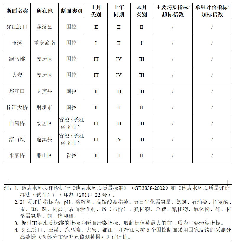 本月遂宁市9个国、省控地表水监测断面水环境质量状况见表2。