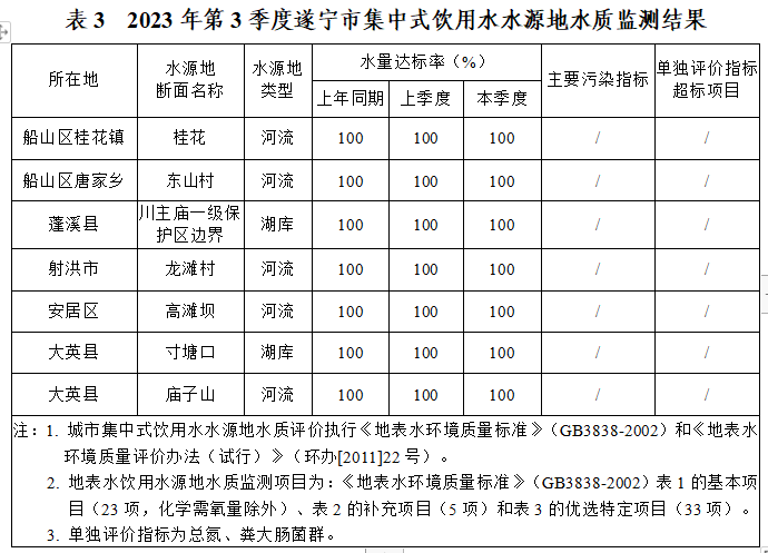 本季度,遂宁市(含县、市、区)集中式饮用水水源地监测断面的水质情况见表3。