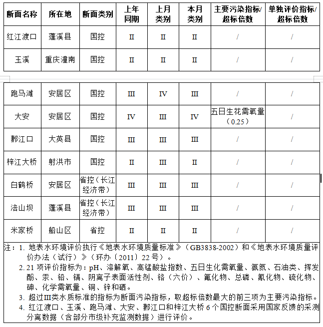 评价标准执行《地表水环境质量标准》(GB 3838-2002)表1中Ⅲ类水质标准,评价方法采用单因子评价法。白鹤桥、涪山坝和米家桥3个断面评价指标为《地表水环境质量评价办法(试行)》(环办〔2011〕22号)规定的21项指标(水温、总氮、粪大肠菌群除外,粪大肠菌群作为参考指标单独评价)。红江渡口、玉溪、跑马滩、大安、郪江口和梓江大桥6个断面采用国家反馈的采测分离数据和我市补充监测数据进行评价,并根据所测项目的监测结果确定断面水质类别。