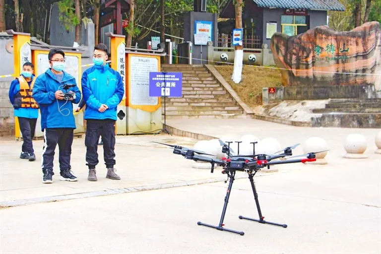 应急监测组使用高光谱无人机对受污染水域进行遥感监测评估。