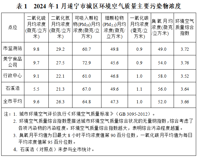 本月遂宁市城区环境空气质量13天优、14天良、4天轻度污染,空气质量达标率为87.1%,主要污染物SO2、NO2、PM10、PM2.5、CO和O3的月均值分别为9.6微克/立方米、26.3微克/立方米、64.8微克/立方米、47.3微克/立方米、1.0毫克/立方米和52.0微克/立方米。同比NO2、PM10、PM2.5、CO和O3浓度分别下降23.5%、37.0%、33.9%、9.1%和36.6%,SO2浓度上升65.5%;环比NO2、PM10、PM2.5和O3浓度分别下降14.1%、13.7%、8.9%和24.6%,SO2和CO浓度分别上升4.3%和11.1%。各测点主要污染物浓度详见表1。