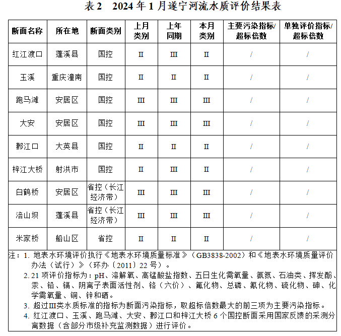 本月遂宁市9个国、省控地表水监测断面(含2个长江经济带断面)水环境质量状况见表2。