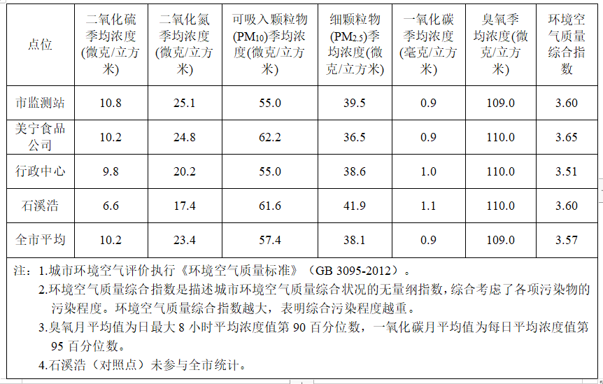 本季度遂宁市城区环境空气质量39天优、45天良、4天轻度污染、1天中度污染、2天重度污染,空气质量达标率为92.3%,主要污染物SO2、NO2、PM10、PM2.5、CO和O3的季度均值分别为10.2微克/立方米、23.4微克/立方米、57.4微克/立方米、38.1微克/立方米、0.9毫克/立方米和109.0微克/立方米。同比NO2、PM10、PM2.5和CO浓度分别下降了28.7%、24.7%、25.4%和18.2%,SO2和O3浓度上升了43.7%和5.6%。环比NO2浓度下降14.0%,SO2、PM10、PM2.5、CO和O3的浓度分别上升14.6%、2.0%、12.7%、12.5%、25.3%。各测点主要污染物浓度详见表1。