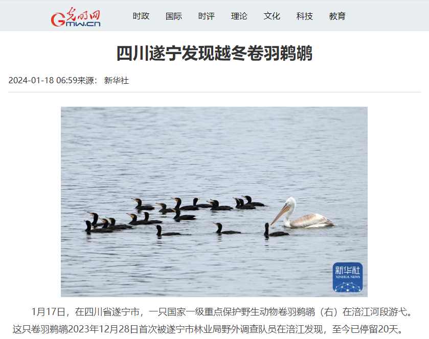 1月18日,光明网关注:四川遂宁发现越冬卷羽鹈鹕