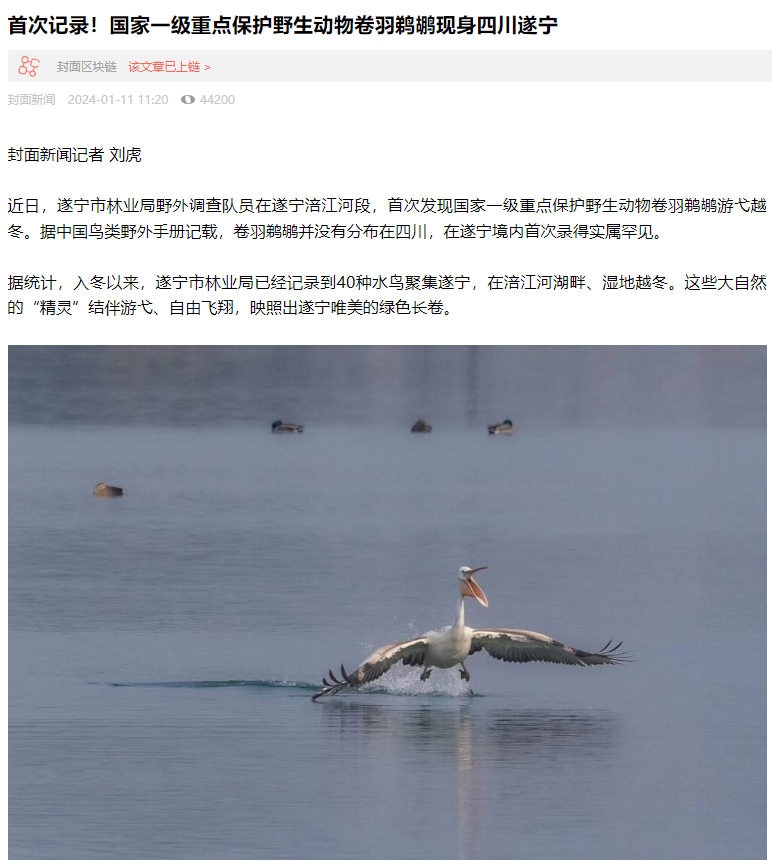1月11日,封面新闻关注:首次记录!国家一级重点保护野生动物卷羽鹈鹕现身四川遂宁