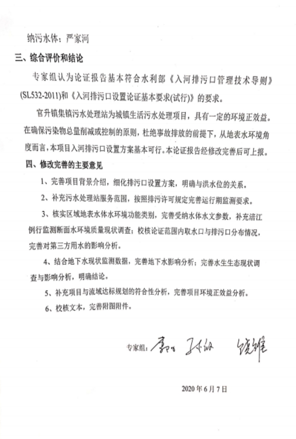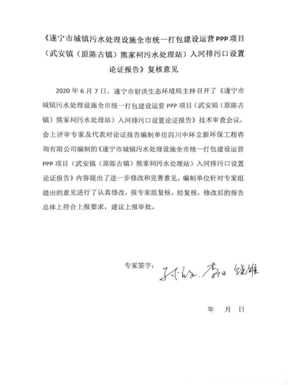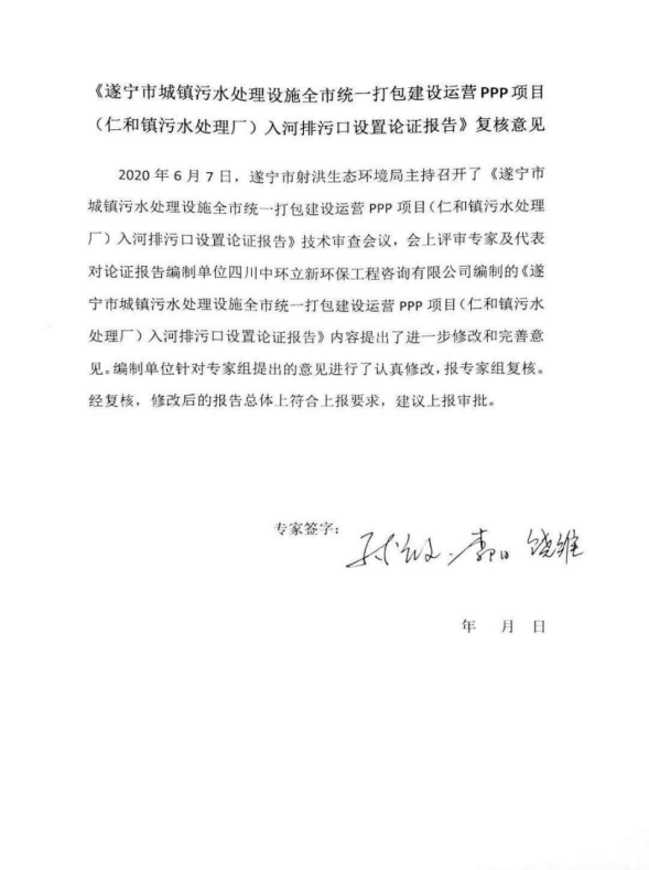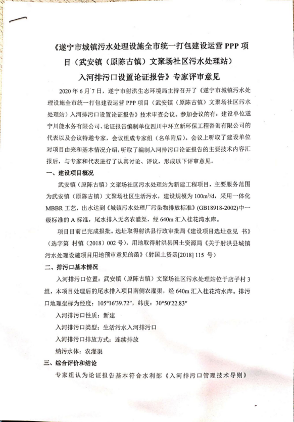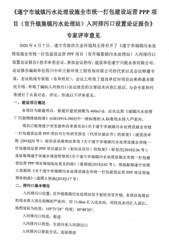 2020年6月7日,我局委托遂宁市射洪生态环境局主持召开了《遂宁市城镇污水处理设施全市统一打包建设营运PPP项目(官升镇、仁和镇、武安镇文聚场社区、武安镇熊家祠)入河排污口设置论证报告》技术审查会议。根据专家和参会人员审查意见,共经过2次全面修改,4个项目入河排污口基本符合设置管理要求,对受纳水域分析评价符合实际,对处理后的废水排放影响预测基本合理,结论基本可行(详见附件)。