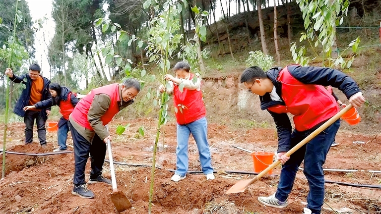 当天,大英县发展改革局组织全体党员、入党积极分子到玉峰镇得鱼沟村,开展“植树护绿党员先行”主题党日活动。党员们热情高涨,干劲十足,挥锹铲土、扶苗填坑、培土浇水,各个环节衔接有序,配合默契。在大家的共同努力下,一排排新栽种的桂花树迎风挺立,为空地增添了一抹新绿与生机。
