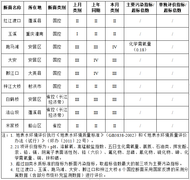 本月遂宁市9个国、省控地表水监测断面水环境质量状况见表2。