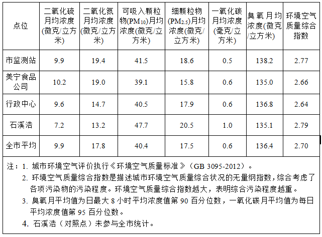 本月遂宁市城区环境空气质量14天优、16天良,空气质量达标率为100%,主要污染物SO2、NO2、PM10、PM2.5、CO和O3的月均值分别为9.9微克/立方米、17.8微克/立方米、40.4微克/立方米、17.5微克/立方米、0.6毫克/立方米和136.4微克/立方米。同比NO2、PM10、PM2.5、CO和O3 浓度分别下降了19.5%、22.3%、27.7%、14.3%和15.9%,SO2浓度上升了26.9%;环比SO2、NO2、PM10、PM2.5和CO浓度分别下降了16.8%、30.7%、26.0%、40.7%和14.3%,O3 浓度上升了2.6%。各测点主要污染物浓度详见表1。