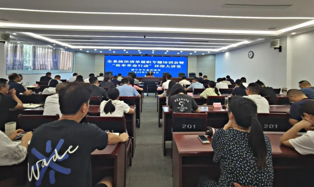 7月25日,遂宁市生态环境系统组织召开依清单履职专题培训会暨“效率革命行动”环保大讲堂。市级联系指导组组长、市委编办副主任胡莉莅会指导,全市生态环境系统干部职工参加培训。