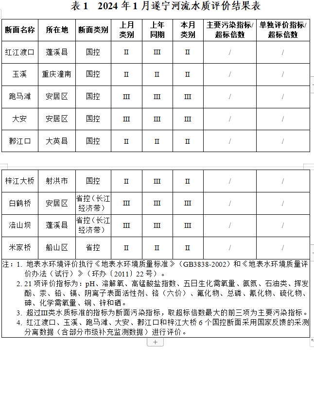 2024年1月,四川省遂宁生态环境监测中心站对遂宁市的9个国、省控地表水监测断面(含2个长江经济带断面)开展了月度环境质量例行监测。