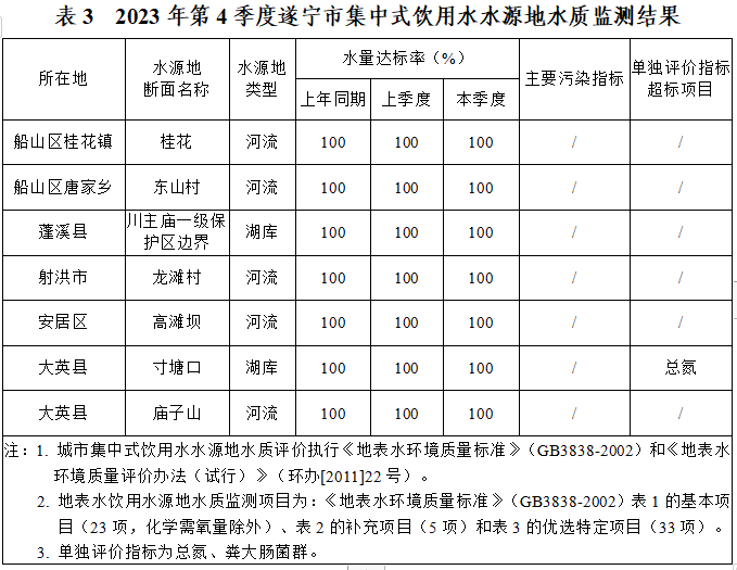 本季度,遂宁市(含县、市、区)集中式饮用水水源地监测断面的水质情况见表3。