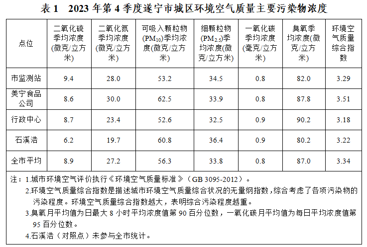 本季度遂宁市城区环境空气质量44天优、40天良、7天轻度污染、1天中度污染,空气质量达标率为91.3%,主要污染物SO2、NO2、PM10、PM2.5、CO和O3的季度均值分别为8.9微克/立方米、27.2微克/立方米、56.3微克/立方米、33.8微克/立方米、0.8毫克/立方米和87.0微克/立方米。同比SO2、PM10、PM2.5和O3浓度分别下降了9.2%、8.3%、8.4%和20.2%,NO2浓度上升了0.4%,CO浓度无变化;环比O3浓度下降了44.1%,SO2、NO2、PM10、PM2.5和CO浓度分别上升了21.9%、49.5%、74.3%、128.4%和60.0%。各测点主要污染物浓度详见表1。