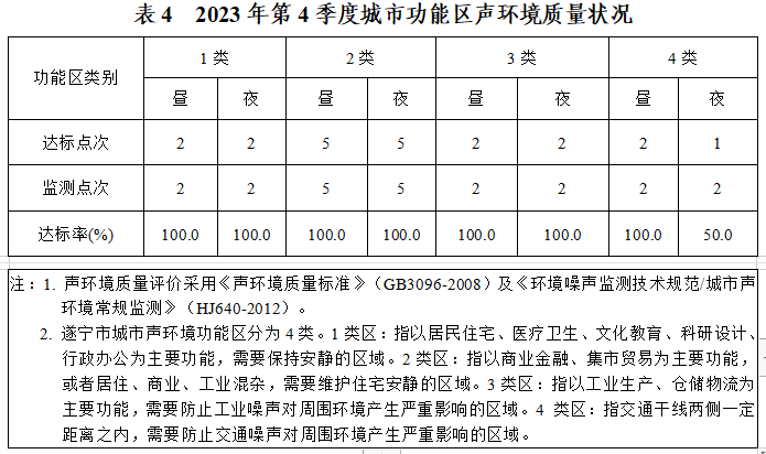 本季度,遂宁市各类功能区昼间噪声、夜间噪声监测点次达标率统计见表4。