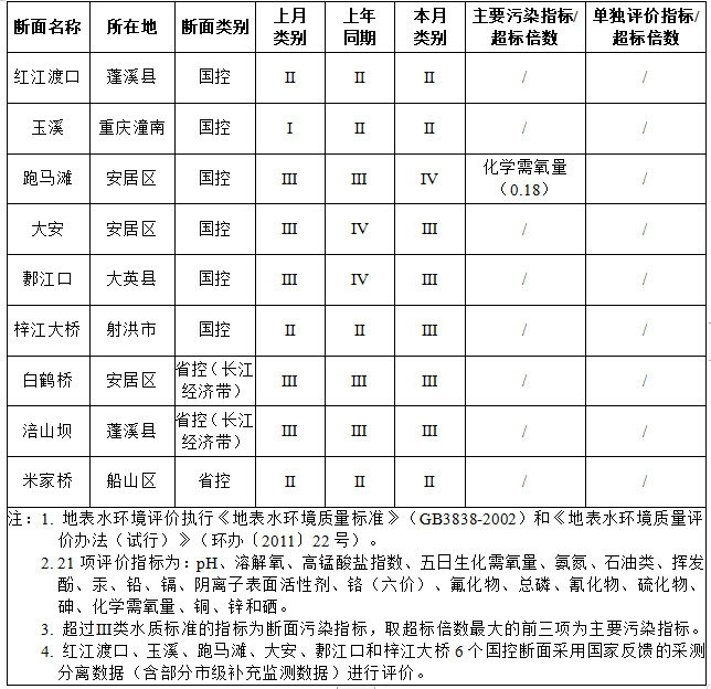 2024年4月,我市9个国、省控地表水监测断面水质优良率为88.9%。其中:红江渡口、玉溪和米家桥3个断面水质类别为Ⅱ类,水质为优;大安、郪江口、梓江大桥、白鹤桥和涪山坝5个断面水质类别为Ⅲ类,水质良好;跑马滩断面水质类别为Ⅳ类,水质轻度污染。具体情况见表1。