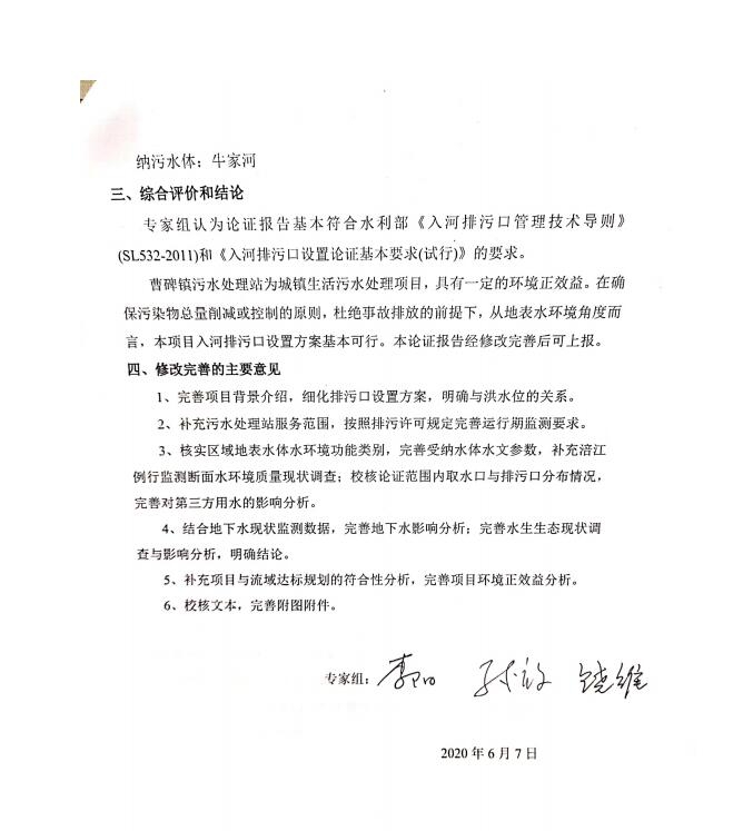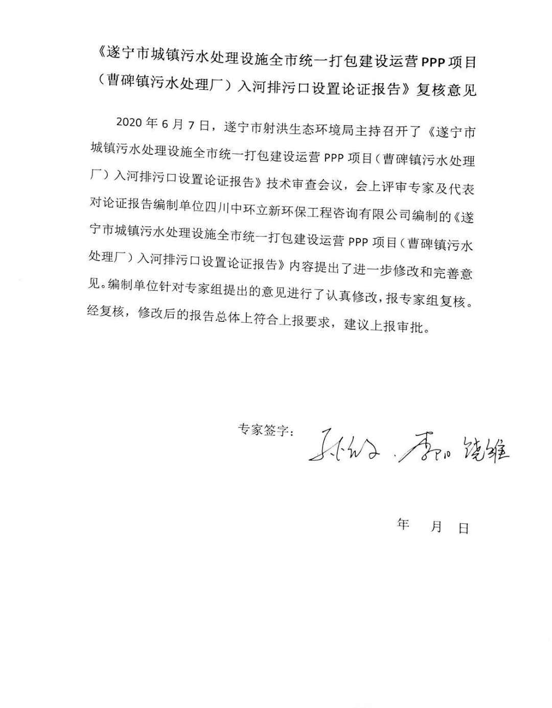 2.《遂宁市城镇污水处理设施全市统一打包建设运营PPP项目(曹碑镇污水处理站)入河排污口设置论证报告》专家复核意见
