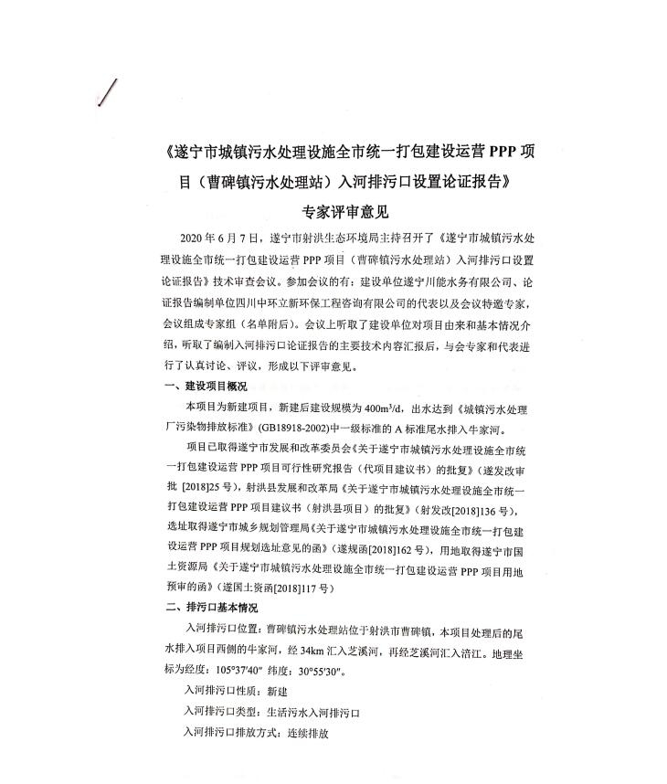 附件:1.《遂宁市城镇污水处理设施全市统一打包建设运营PPP项目(曹碑镇污水处理站)入河排污口设置论证报告》专家评审意见