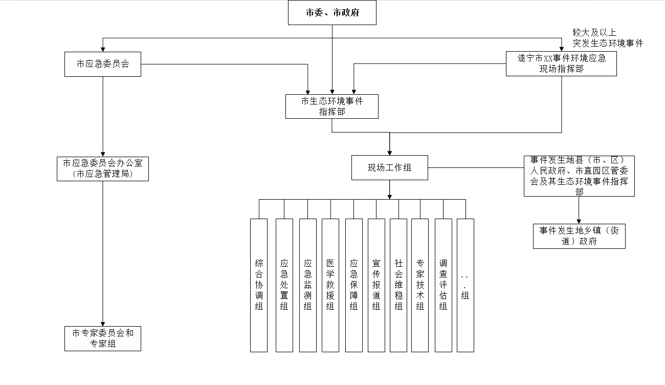 遂宁市生态环境事件指挥部(以下简称市指挥部)是市应急委员会下设的专门负责处置突发生态环境事件的市级专项组织指挥机构,在市委、市政府领导下,负责统一组织、指挥和协调全市突发生态环境事件应急工作。