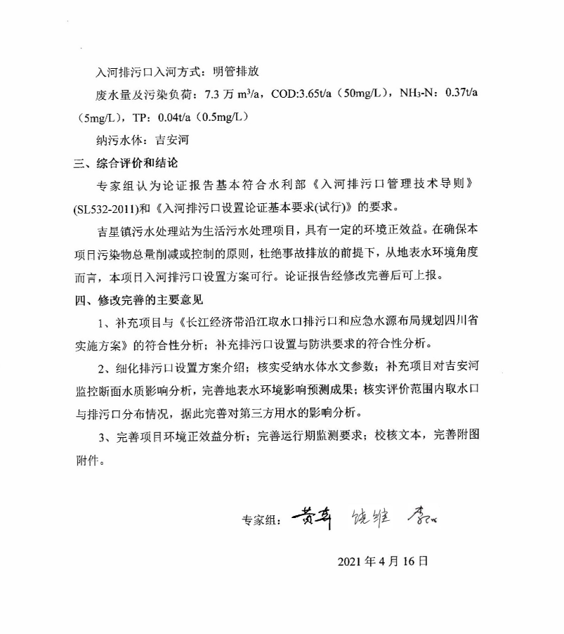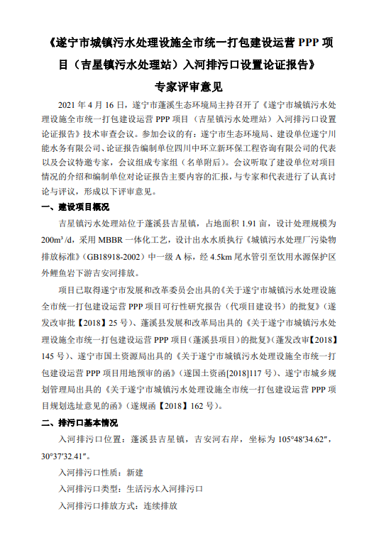 附件:《遂宁市城镇污水处理设施全市统一打包建设运营PPP项目(吉星镇污水处理站)入河排污口设置论证报告》专家审查意见