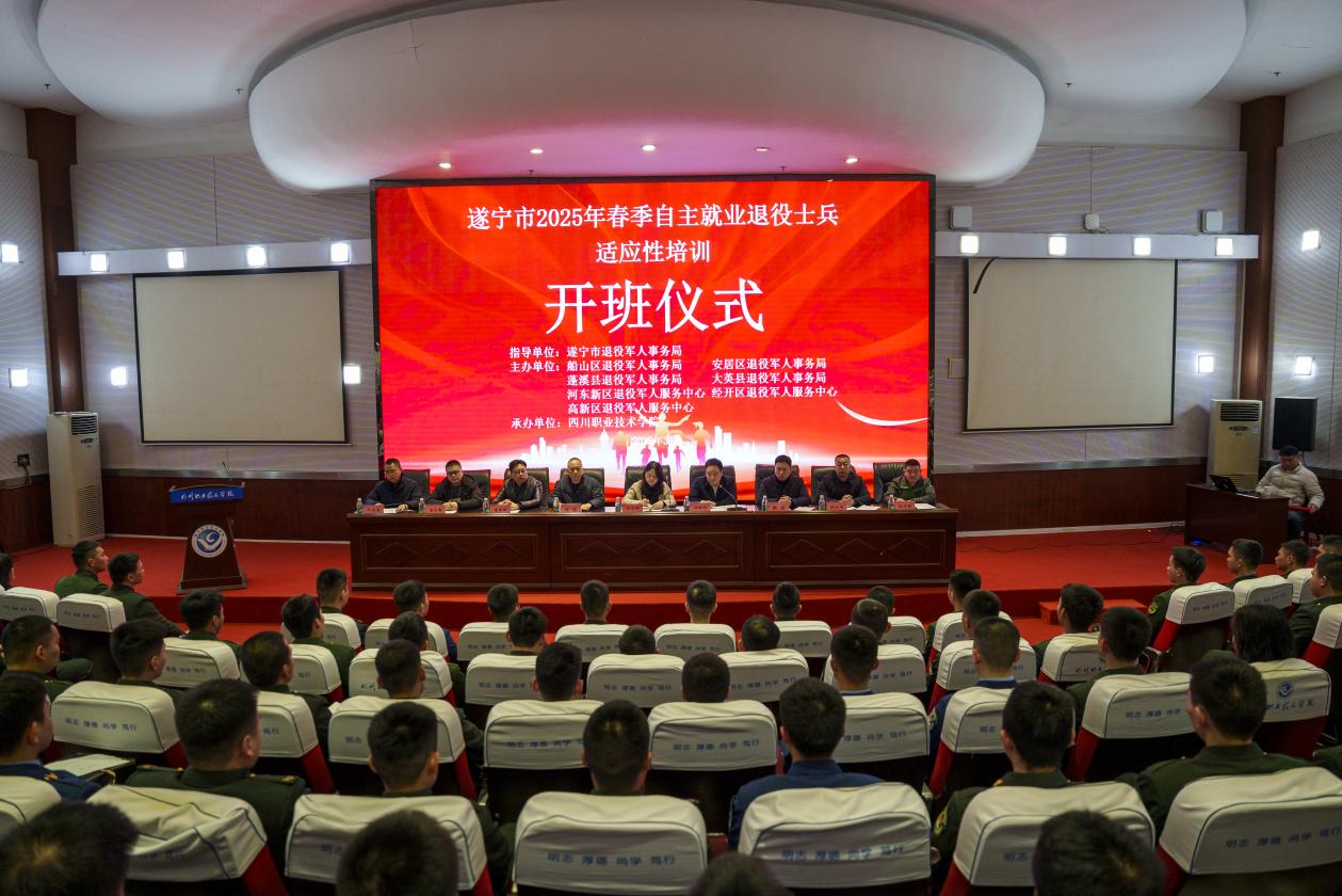 仪式上,四川职业技术学院副校长彭亚娜在致辞中提到,本次培训将重点做到“三个精准”:一是课程设计精准,设置“心理调适+职业测评+技能实训”三阶课程;二是资源保障精准,开放智能制造、电子商务等实训基地,匹配“理论授课+企业观摩+模拟路演”多元场景;三是服务对接精准,联合遂宁本地和川渝两地的企业为参加培训的学员们提供充足的岗位,整合周边市(州)的退役军人学员资源,“政-校-企”三方联动,深化校企合作、产教融合,全力为区域产业发展培养政治素质高、专业能力强、服务态度好、综合素质优的高技能退役军人。
