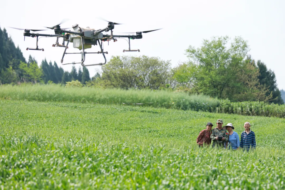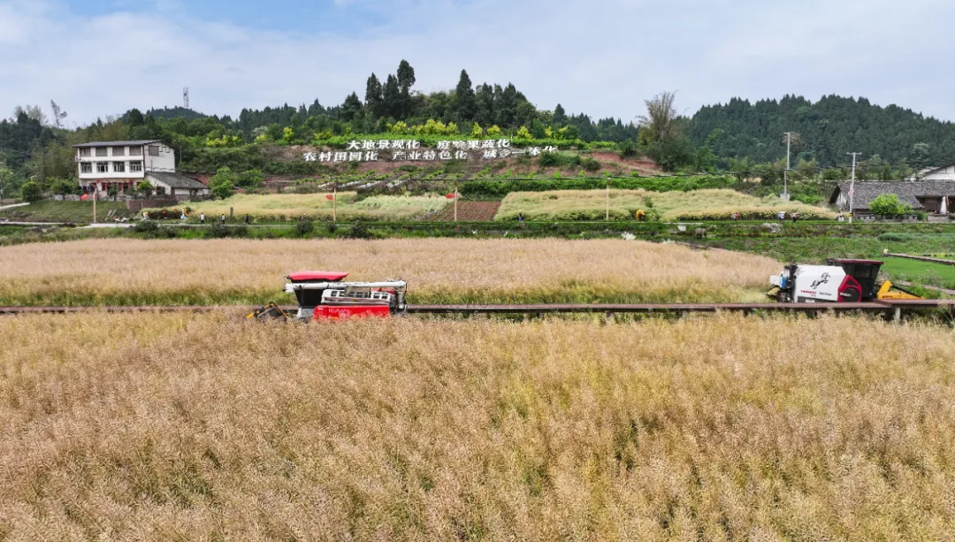 五月的乡野浸染在夏初的浓翠之中,成熟的油菜荚在微风中漾起金色涟漪,稻虾共生田泛着银亮水光,仿若大地跳动的脉搏。在四川省遂宁市安居区的阡陌间,穿梭的迷彩身影,翱翔的无人机,轰鸣的收割机,传统农耕智慧与现代科技力量在此交融,勾勒出一幅乡村振兴的美丽画卷。