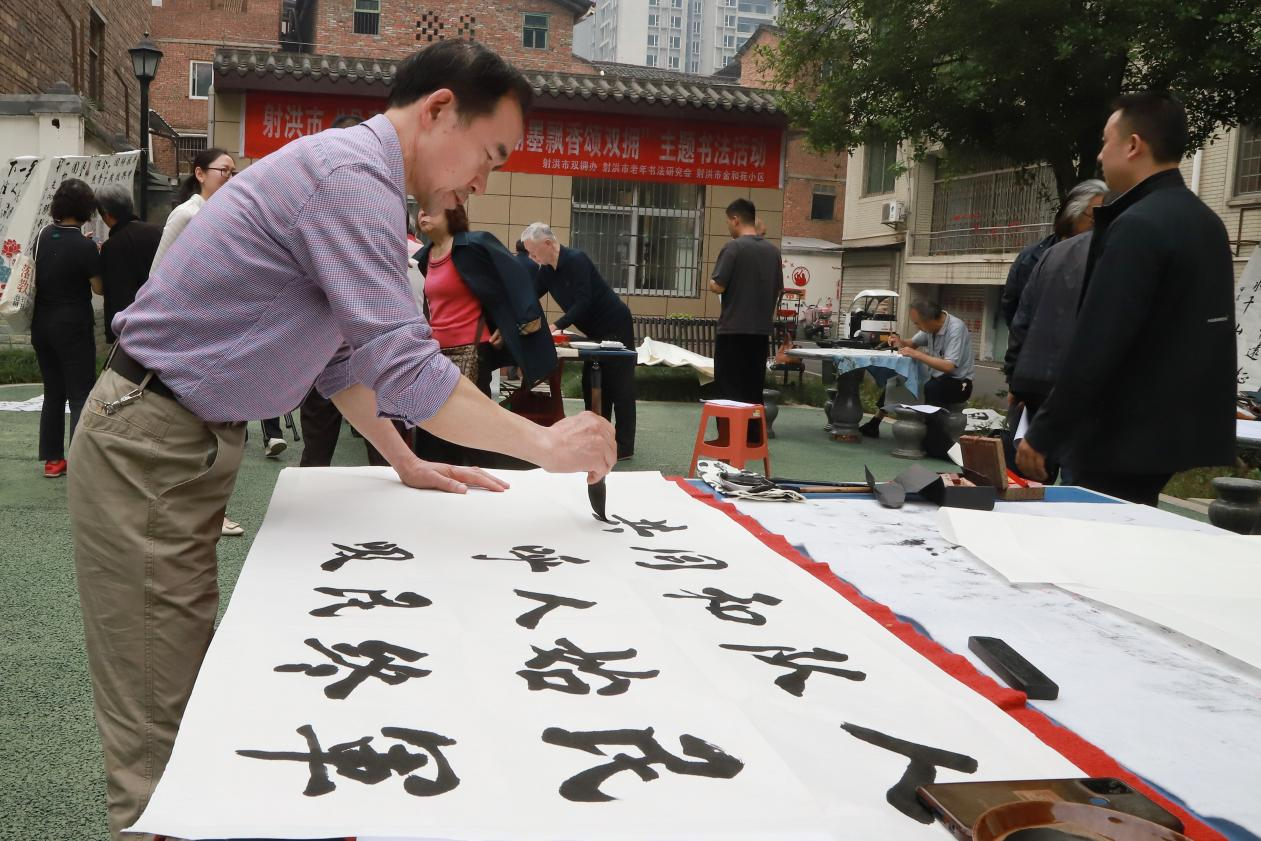 5月7日上午,射洪市双拥办在市双拥小区金和苑举办“丹青妙笔书百强,翰墨飘香颂双拥”主题书画活动,市老年书法研究会书画家、金和苑居民和退役军人代表等参加活动。