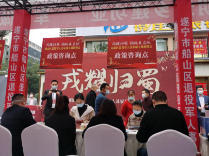 为帮助退役军人及家属实现高质量就业,吸纳更多优质退役军人及其家属为园区企业高质量发展贡献力量,11月11日,遂宁市船山区退役军人事务局与高新区退役军人服务中心联合举办“戎耀归蜀 扬帆再启航”退役军人及其家属专场招聘会。招聘会线上线下同时举行,线上招聘企业30家,线下入场招聘企业近50家,共提供就业岗位1000余个。当天,线上有2000余人进入直播间,300余人进行互动咨询,60余人进行了岗位投递;线下有200余人进行求职咨询,近100人达成初步就业意向。