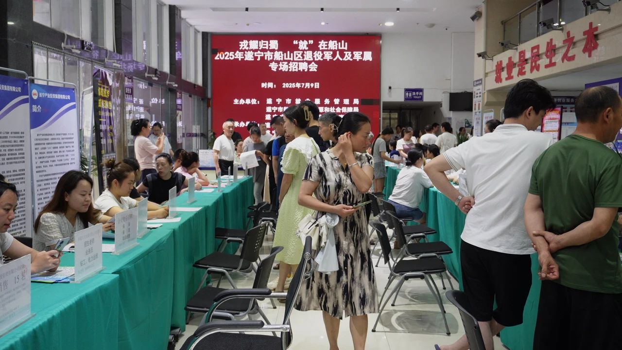 为深入贯彻党的二十届三中全会精神和习近平总书记关于退役军人工作重要指示,全面落实国家及省市关于退役军人就业创业的决策部署,切实将党和国家对退役军人的关怀落到实处,7月9日,由遂宁市就业服务管理局指导,船山区人力资源和社会保障局、船山区退役军人事务局联合主办的“2025年戎耀归蜀 ‘就’在船山——退役军人政策宣讲会暨专场招聘会”圆满举行。活动精准服务领取失业保险金退役军人、自主就业退役士兵、自主择业军转干部、复员干部及军属,搭建高效就业对接平台。
