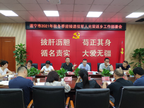 为切实做好2021年全市退役军人光荣返乡迎接工作,营造全社会拥军尊军崇军的氛围,8月23日,遂宁市退役军人事务局召开2021年秋冬季迎接退役军人光荣返乡工作部署会。市退役军人局党组成员、市退役军人服务中心主任舒天忠主持会议。各县(市、区)退役军人局分管负责同志,各县(市、区)及市直园区退役军人服务中心主任,市退役军人服务中心班子成员、各科室负责人参加会议。