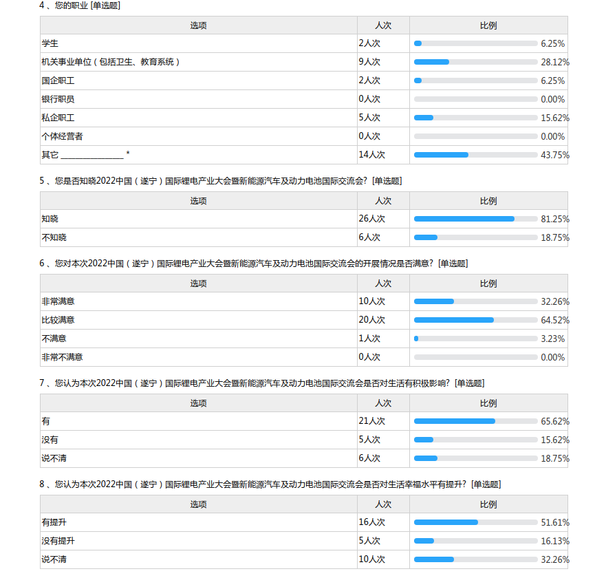 - 8、您认为本次2022中国(遂宁)国际锂电产业大会暨新能源汽车及动力电池国际交流会是否对生活幸福水平有提升? [单选题]