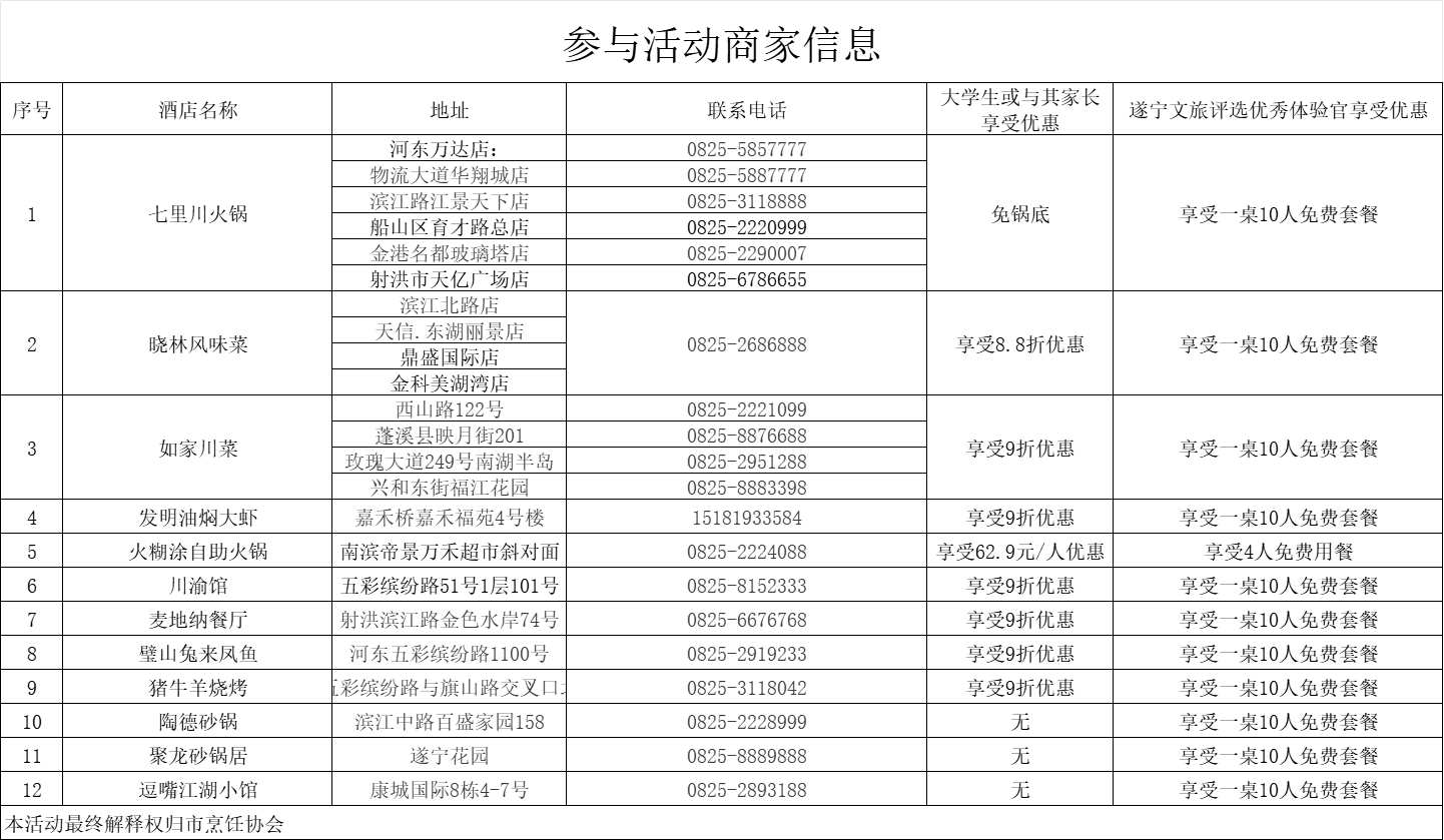 2、通过遂宁文旅促消费宣传活动评选出的优秀大学生,可在以下餐饮店享受一桌免费套餐。以遂宁文旅促消费宣传评选活动公布的信息为准。
