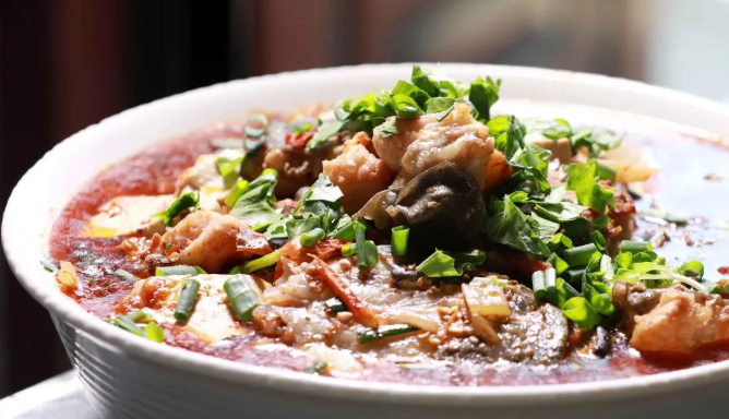 不仅烹制的手艺体现出江湖气息,上菜形式也相当豪爽,往往是大盘盛肉,大盆装汤。一大碗红彤彤的鱼汤,闻起来香气四溢, 而舀起汤里的鱼块,质地竟然跟豆腐一样,用筷子轻轻一夹就碎。入口之后,爽滑细嫩、香辣回甜,油而不腻,鲜而不腥,百吃不厌!