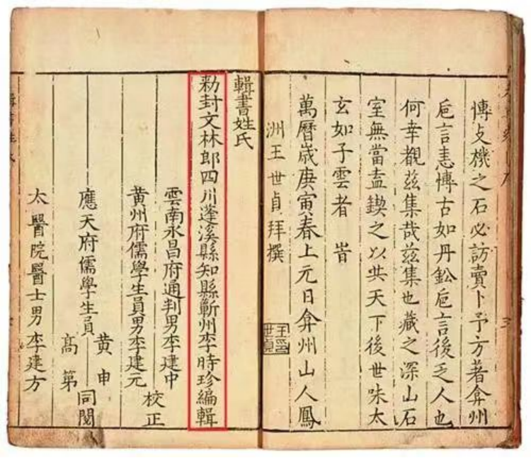 《本草纲目》刻印之事,也是由李建中办理。《本草纲目》出版时,作者署名是:“敕封文林郎、四川蓬溪县知县