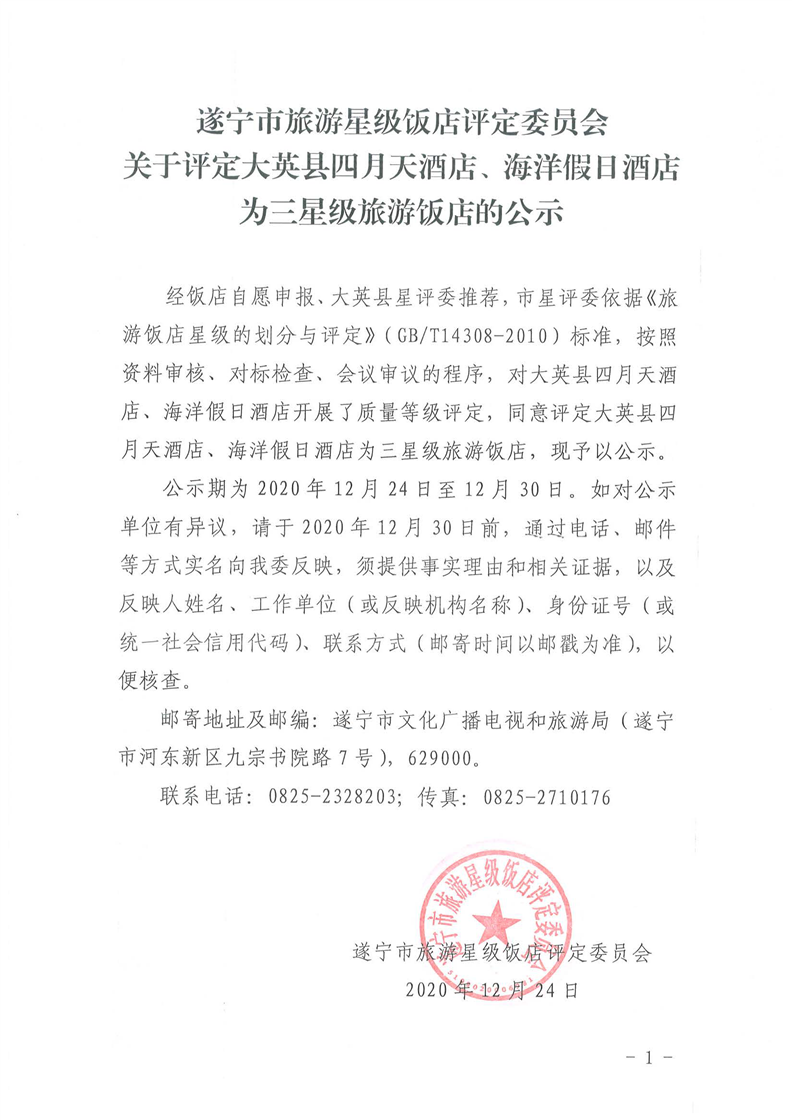 遂宁市旅游星级饭店评定委员会关于评定大英县四月天酒店、海洋假日酒店为三星级旅游饭店的公示